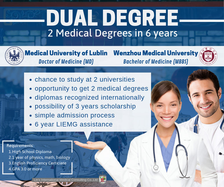 본 과정은 유럽 MD 학위와 중국 MBBS 학위를 동시에 취득할 수 있는 프로그램으로 린스국제교육그룹 산하 MUL-APC INC.의 주도로 만들어졌습니다. 폴란드의 루블린의과대학과 중국의 원저우의과대학이 참여하고 있으며 졸업 후 두 개의 학위가 동시에 수여됩니다. 본 과정은 독일, 스페인, 영국, 미국, 한국, 태국 국적의 재학생들이 선택한 프로그램입니다.